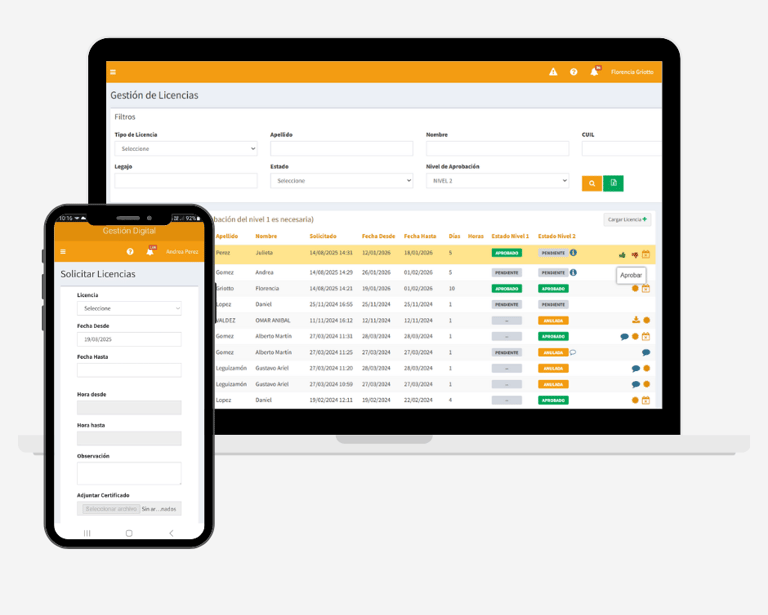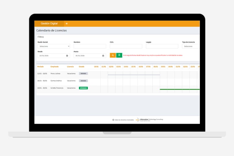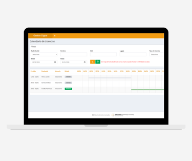 El calendario integrado te permite ver todas las solicitudes de licencias y vacaciones de un vistazo. Identificá fácilmente si hay fechas superpuestas, y tomá decisiones rápidas para garantizar la continuidad operativa.